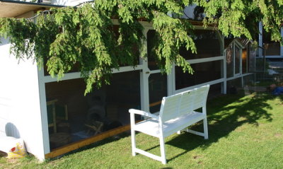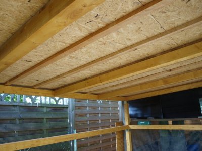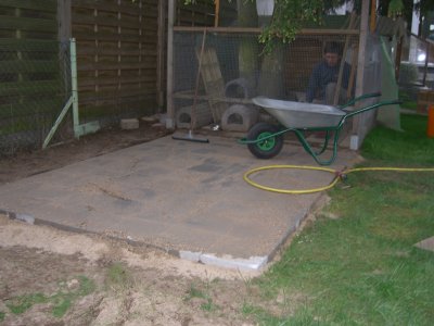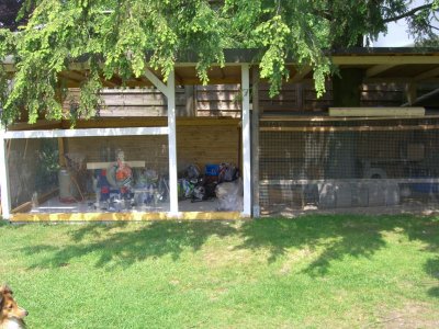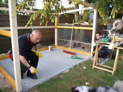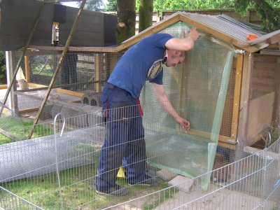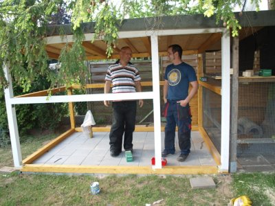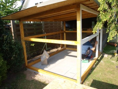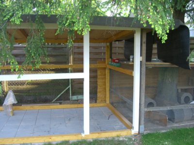 Das neue Gehege ist begehbar und bekommt ein festes Dach ( auch als Sonnenschutz). Wie das alte Gehege wird natürlich mardersicherer verzinkter Vierkantdraht verwendet. Nach unten wird das Gehege mit Platten gesichert. Mit Buddeln ist also nix!!!!Nur in der Buddelkiste!